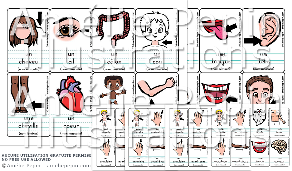 Les mots illustrés sont: aisselle, annulaire, auriculaire, avant-bras, barbe, bouche, bras, cerveau, cheveu, cheville, cil, coeur, côlon, corps, cou, coude, cuisse, dent, doigt, épaule, estomac, fesse, fille, foie, front, garçon, gencive, genou, humains, index, intestins, intestin grêle, gros intestin, iris, jambe, joue, langue, lèvre, lobe, mâchoire, main, majeur, menton, mollet, moustache, muscle, narine, nombril, nuque, ongle, oreille, organes, orteil, os, pancréas, paupière, pavillon, peau, pénis, pied, plante (du pied), poignet, pouce, poumons, pupille, rein, sang, sein, sourcil, squelette, talon, tête, torse, vaisseaux, ventre, vessie, visage, vulve, nez, oeil, yeux, dos.