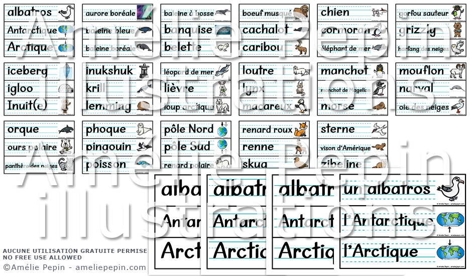 Les mots illustrés sont: albatros, Antarctique, Arctique, aurore boréale, baleine bleue, baleine boréale, baleine à bosse, banquise, belette, boeuf musqué, cachalot, caribou, chien, cormoran, éléphant de mer, gorfou sauteur, grizzly, harfang des neiges, iceberg, igloo, Inuits, inukshuk, krill, lemming, léopard de mer, lièvre, loutre, loup arctique, lynx, macareux, manchot, manchot de Magellan, morse, mouflon, narval, oie des neiges, orque, ours polaire, panthère des neiges, phoque, pingouin, poisson, pôle Nord, pôle Sud, renard polaire, renard roux, renne, skua, sterne, vison d'Amérique, zibeline.