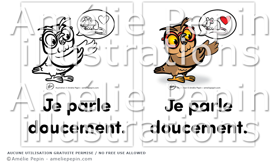Règle de classe illustrée avec un hibou: "Je parle doucement."