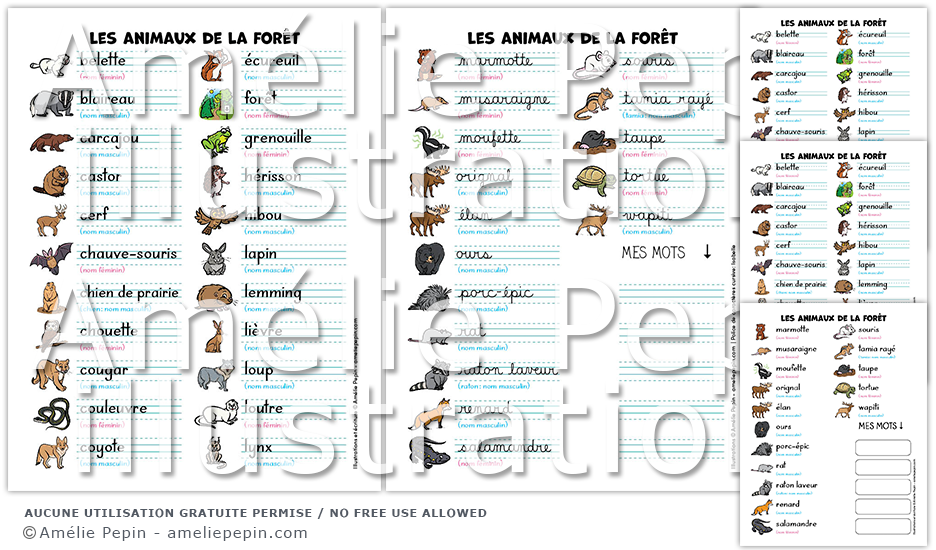 Les mots illustrés sont: belette, blaireau, carcajou, castor, cerf, chauve-souris, chien de prairie, chouette, cougar, couleuvre, coyote, écureuil, forêt, grenouille, hibou, lapin, lemming, lièvre, loup, loutre, lynx, marmotte, musaraigne, moufette, orignal, élan, ours, porc-épic, rat, raton laveur, renard, salamandre, souris, tamia rayé, taupe, tortue, wapiti.