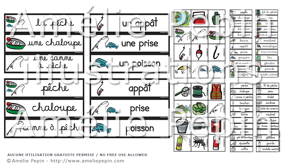 Les mots illustrés sont: pêche, chaloupe, canne à pêche, bouchon, hameçon, leurre, appât, prise, poisson, gilet de sauvetage, épuisette, coffre, fil de pêche, seau, chalet, sardines, boite de conserve, moulinet, moustique, chasse-moustique, glacière, gourde, bouteille isolante, lac.