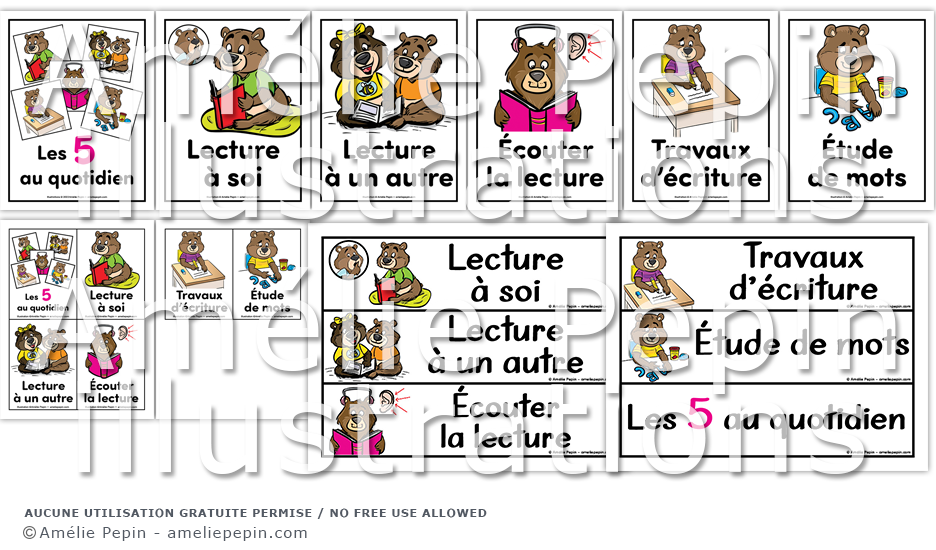 Les 5 au quotidien représentés par des ours: lecture à soi, lecture à un autre, écouter la lecture, travaux d'écriture et étude de mots.