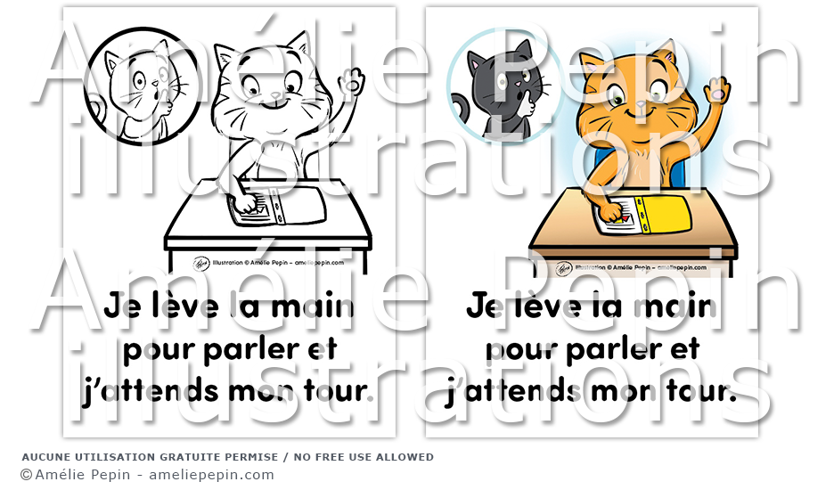 Règle de classe illustrée avec un chat assis au bureau: "Je lève la main pour parler et j'attends mon tour."