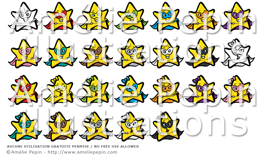 Ce dossier contient des images d'étoiles (garçons et filles) en superhéros de différentes couleurs: rouge, jaune, vert, bleu, orange, violet, rose, turquoise, brun, gris, noir et blanc.