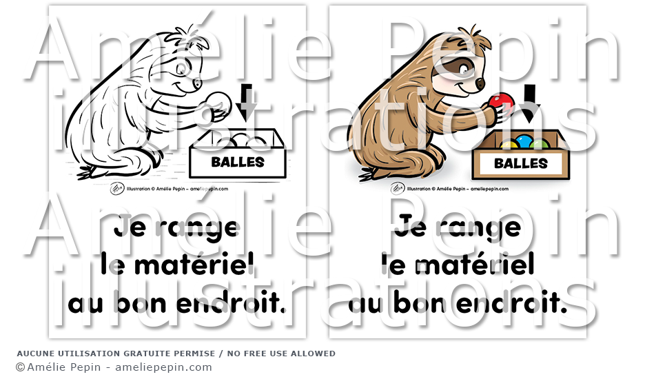 Règle de classe illustrée avec un paresseux: "Je range le matériel au bon endroit."