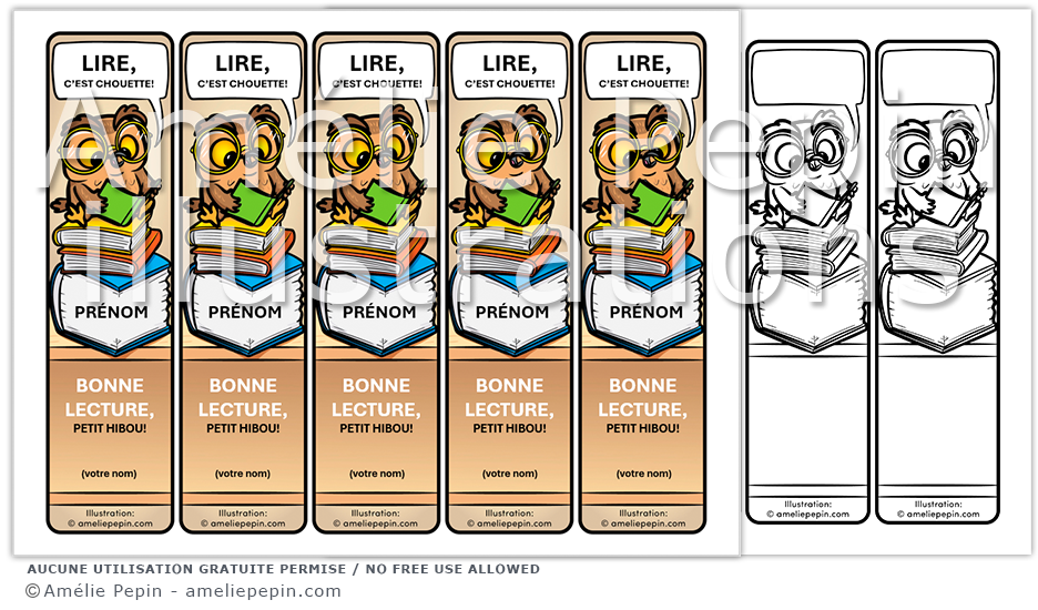 Signets aux coins arrondis illustrés avec un hibou assis sur une pile de livres. Les textes suggérés que vous pouvez changer sur le signet sont: «Lire, c'est chouette!» et «Bonne lecture, petit hibou!».