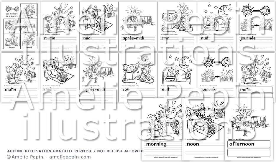 Dessins à colorier et exercices d'écriture sur les moments de la journée illustrés avec des souris. Le document contient les mots suivants en français: matin, midi, après-midi, soir, nuit, journée. Une page couverture qui contient les moments de la journée sans lignes est incluse. Pour les pages intérieures, choisissez entre des lignes "trottoirs", doubles, ou encore, une version sans lignes (rectangles pour écrire).
