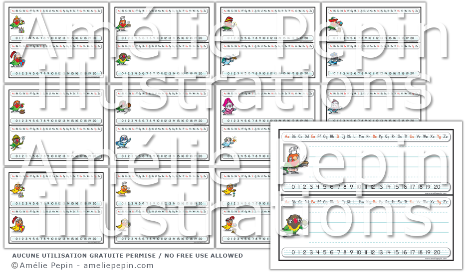 Chaque étiquette contient les lettres de l'alphabet avec les voyelles écrites en rouge, un trottoir pour écrire le prénom de l'enfant ainsi que les nombres de 0 à 20. La version PowerPoint vous permet d'écrire le nom de l'enfant à l'ordinateur (il n'y a pas de trottoir dans cette version). Assurez-vous d'avoir le logiciel Microsoft PowerPoint installé sur votre ordinateur pour ouvrir cette version.