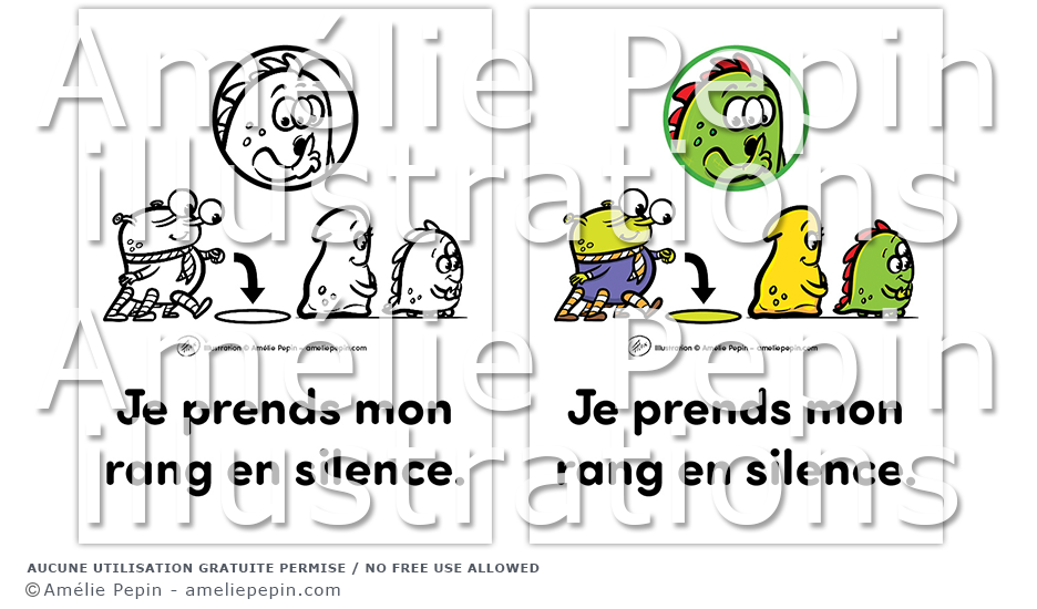 Règle de classe illustrée avec des monstres: "Je prends mon rang en silence."