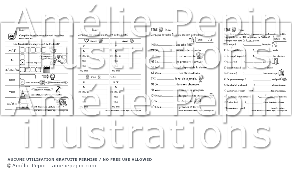 - Tableaux de conjugaison à remplir des verbes: aimer, avoir et être. Un tableau vierge est inclus. (page 2)