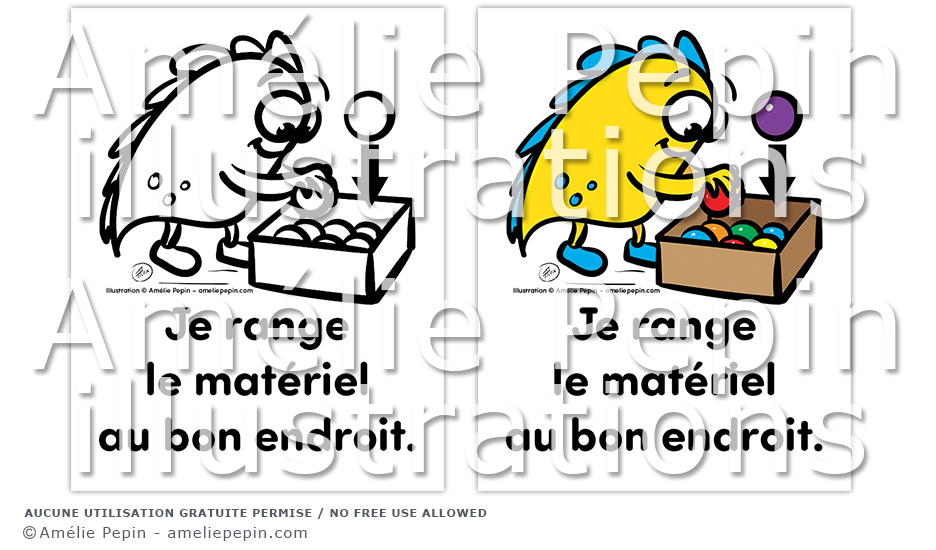 Règle de classe illustrée avec des monstres: "Je range le matériel au bon endroit."
