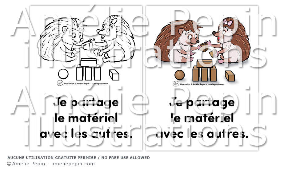 Règle de classe illustrée avec des hérissons: "Je partage le matériel avec les autres."