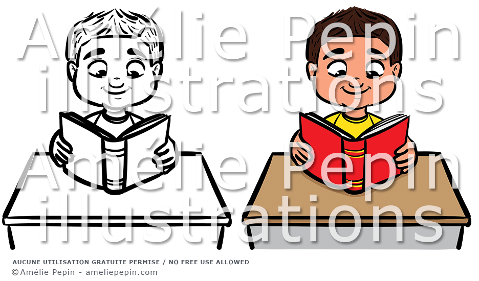 Ce dossier contient 6 modèles d'enfants qui lisent un livre assis à leur pupitre avec quelques choix de couleurs de peau.