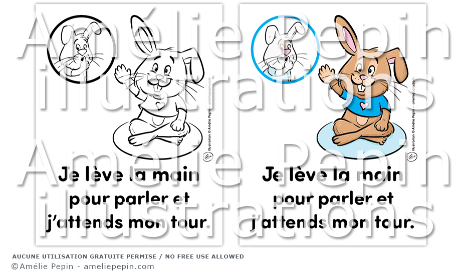 Règle de classe illustrée avec des lapins: "Je lève la main pour parler et j'attends mon tour."