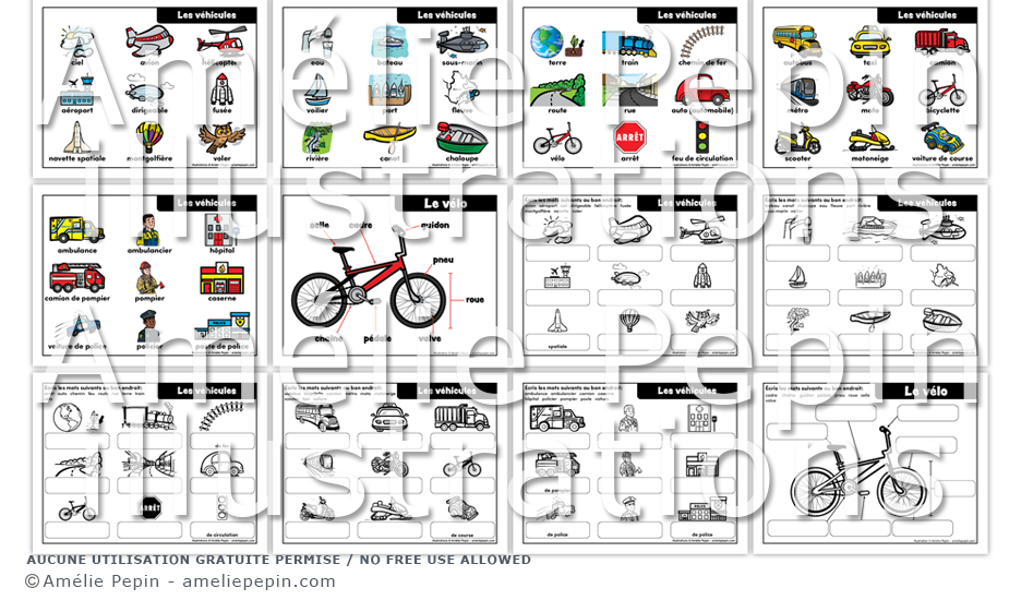 Les fiches contiennent les mots suivants: ciel, avion, hélicoptère, aéroport, dirigeable, fusée, navette spatiale, montgolfière, voler, eau, bateau, sous-marin, voilier, port, fleuve, rivière, canot, chaloupe, terre, train, chemin de fer, route, rue, auto (automobile), vélo, arrêt, feu de circulation, autobus, taxi, camion, métro, moto, bicyclette, scooter, motoneige, voiture de course, ambulance, ambulancier, hôpital, camion de pompier, pompier, caserne, voiture de police, policier, poste de police. Les mots en lien avec le vélo sont: selle, cadre, guidon, pneu, roue, valve, pédale, chaîne.