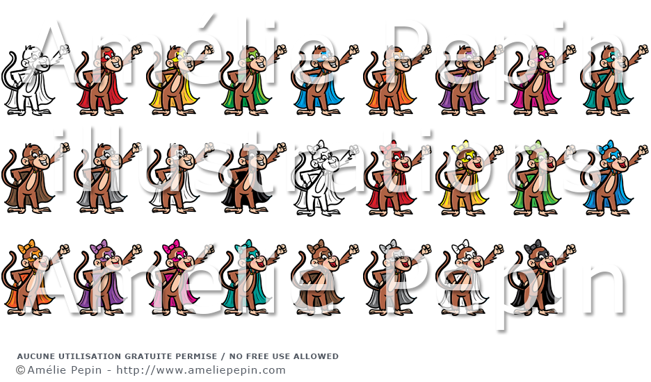 Ce dossier contient des images de singes (garçons et filles) en superhéros de différentes couleurs: rouge, jaune, vert, bleu, orange, violet, rose, turquoise, brun, gris, noir et blanc.