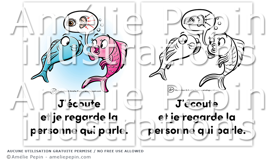 Règle de classe illustrée avec des poissons: "J'écoute et je regarde la personne qui parle."