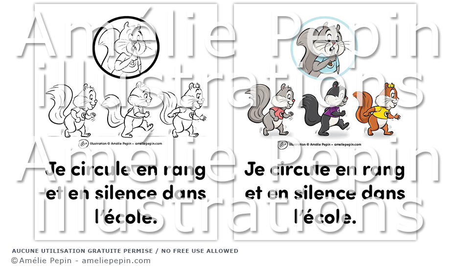 Règle de classe illustrée avec des écureuils: "Je circule en rang et en silence dans l'école."