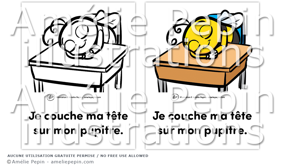 Règle de classe illustrée avec une abeille: "Je couche ma tête sur mon pupitre."