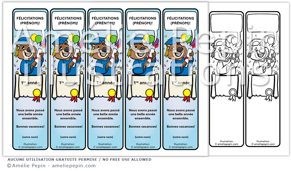 Signets aux coins arrondis illustrés avec un ours très heureux d'avoir obtenu son diplôme de fin d'année scolaire.