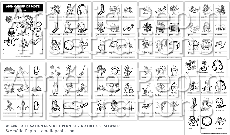 Utilisez ce document en tant que recueil de mots illustrés (dictionnaire) ou comme cahier d'écriture de mots sur le thème de l'hiver. Les enfants peuvent colorier les dessins. Quatre versions sont incluses: sans lignes (rectangles pour écrire), avec lignes trottoirs, lignes doubles ou lignes calligraphiques.