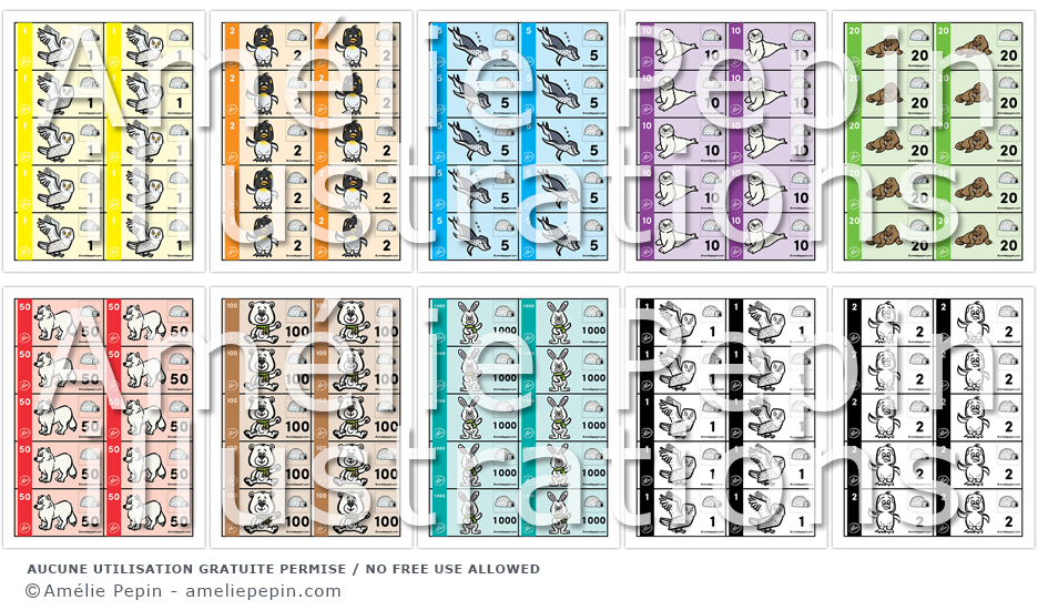 Ces documents contiennent les billets de 1$, 2$, 5$, 10$, 20$, 50$,100$ et 1000$. Sauvez de l'encre en imprimant la version en noir et blanc sur du papier teinté.