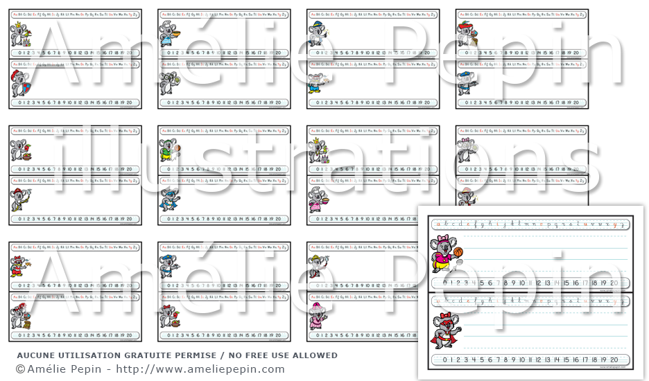 Chaque étiquette contient les lettres de l'alphabet en cursive avec les voyelles écrites en rouge, un trottoir pour écrire le prénom de l'enfant ainsi que les nombres de 0 à 20. La version PowerPoint vous permet d'écrire le nom de l'enfant à l'ordinateur (il n'y a pas de trottoir dans cette version). Assurez-vous d'avoir le logiciel Microsoft PowerPoint installé sur votre ordinateur pour ouvrir cette version.