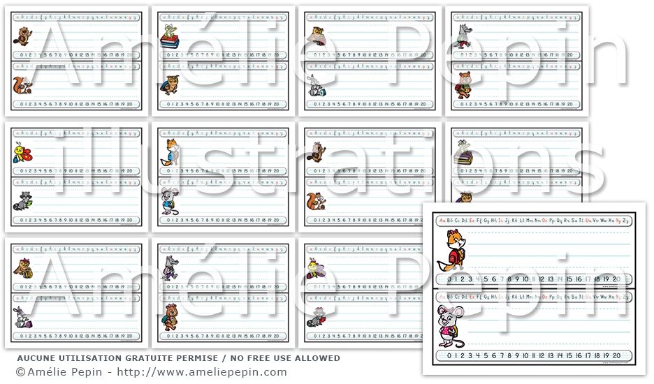 Chaque étiquette contient les lettres de l'alphabet en cursive avec les voyelles écrites en rouge, un trottoir pour écrire le prénom de l'enfant ainsi que les nombres de 0 à 20. La version PowerPoint vous permet d'écrire le nom de l'enfant à l'ordinateur (il n'y a pas de trottoir dans cette version). Assurez-vous d'avoir le logiciel Microsoft PowerPoint installé sur votre ordinateur pour ouvrir cette version.