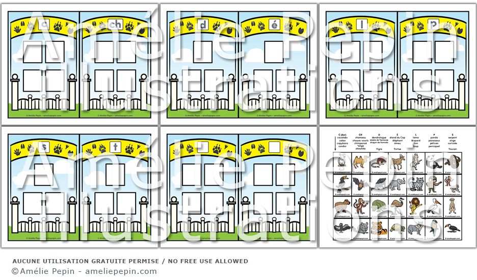 Vous pouvez plastifier ce document et coller des velcros sous les images et sur les quatre zoos. Une page sans lettre est également incluse si vous désirez inventer d'autres sons vedettes. Cette activité permet de réviser le vocabulaire en lien avec les animaux du zoo.