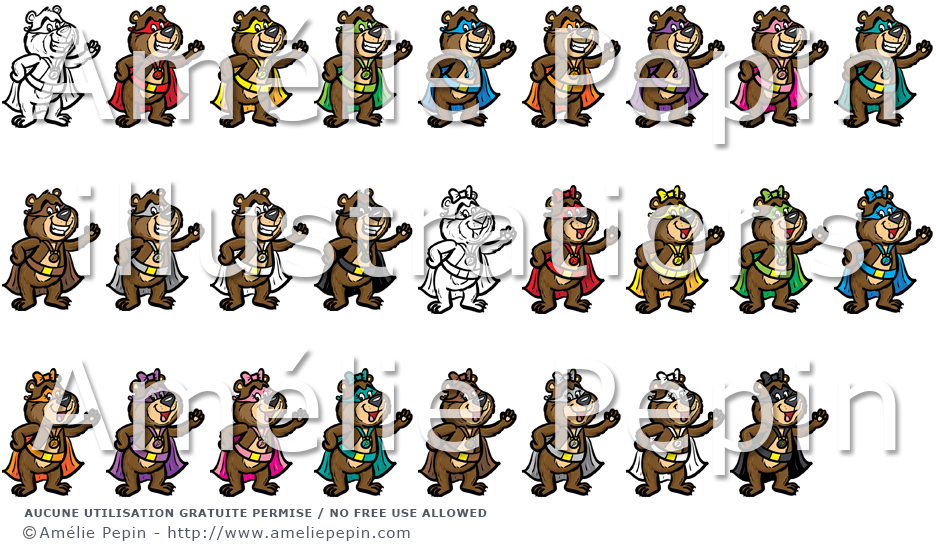 Ce dossier contient des images d'ours (garçons et filles) en superhéros de différentes couleurs: rouge, jaune, vert, bleu, orange, violet, rose, turquoise, brun, gris, noir et blanc.