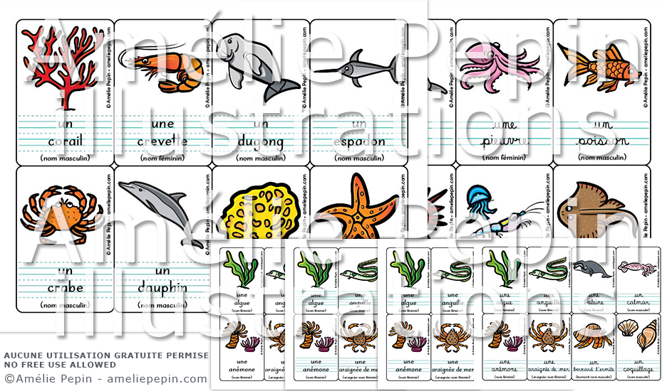 Les mots illustrés sont: algue, anémone, anguille, araignée de mer, baleine, bernard l'ermite, calmar, coquillage, corail, crabe, crevette, dauphin, dugong, éponge de mer, espadon, étoile de mer, hippocampe, homard, iguane, limule, marsouin, méduse, mer, murène ruban, océan, orque, otarie, oursin, pieuvre, plancton, poisson, raie, requin, tortue de mer.