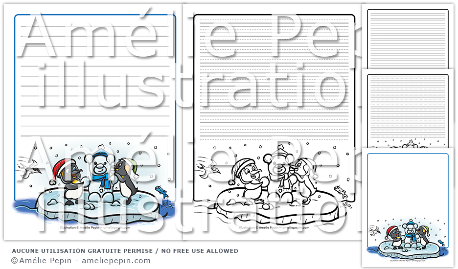 Gabarit d'écriture illustré avec deux manchots qui font un ours en neige pendant qu'une sterne et un poisson admirent leur travail. Utilisez ce papier à lettres pour vos compositions de texte sur les thèmes des mondes polaires et de l'hiver, pour des affiches, pour vos feuilles de notes dans votre planificateur, ou encore, pour vos communications avec les parents. Les plus jeunes peuvent faire un dessin dans l'encadré qui ne contient pas de lignes. La version Microsoft Word (.docx) vous permet d'écrire votre texte à l'ordinateur, elle n'est pas lignée.