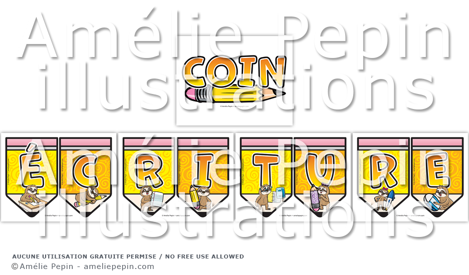 Créez un bel affichage pour votre coin écriture avec cette banderole illustrée avec des paresseux. Chaque page contient deux fanions en forme de crayon. Chaque fanion mesure environ 7,5 po de hauteur sur 4,9 po de largeur. Découpez chaque lettre et collez-les à votre mur, ou encore, conservez une bande blanche au-dessus du fanion lorsque vous découpez ceux-ci pour pouvoir plier cette partie sur une corde à suspendre. De plus, une page contient le mot "coin" à découper en un seul morceau.