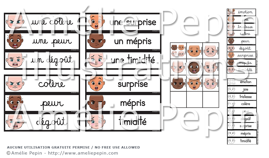 Les mots illustrés sont: émotion, joie, tristesse, colère, dégoût, peur, mépris, surprise, timidité.