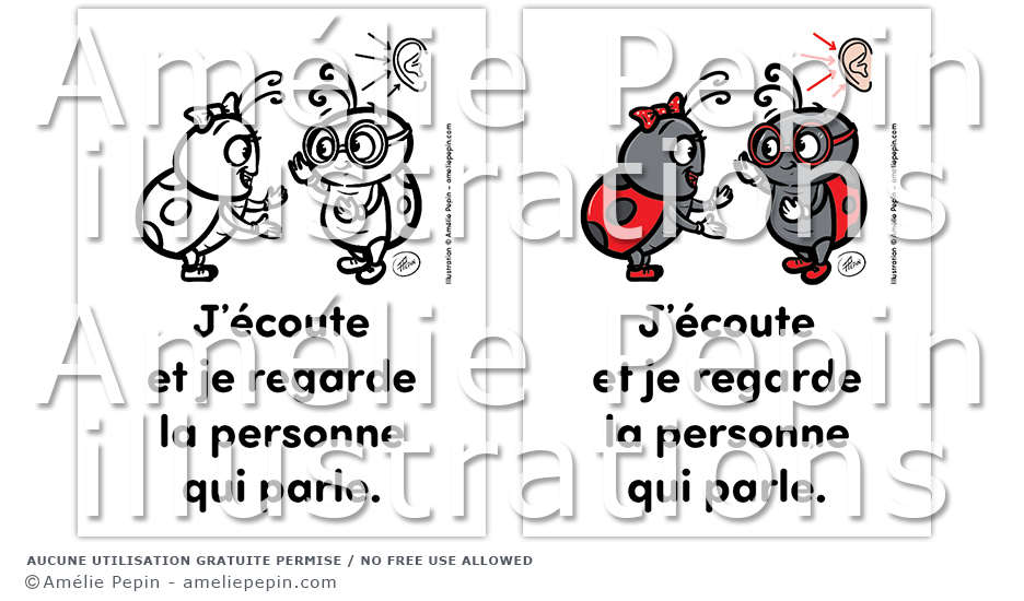 Règle de classe illustrée avec des coccinelles: "J'écoute et je regarde la personne qui parle."