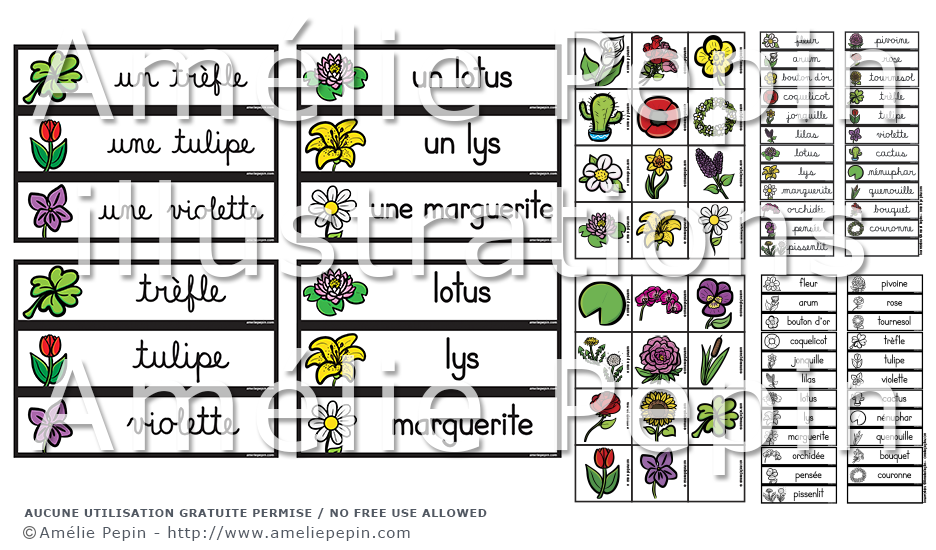 Les mots illustrés sont: fleur, arum, bouton d'or, coquelicot, jonquille, lilas, lotus, lys, marguerite, orchidée, pensée, pissenlit, pivoine, rose, tournesol, trèfle, tulipe, violette, cactus, nénuphar, quenouille, bouquet, couronne.