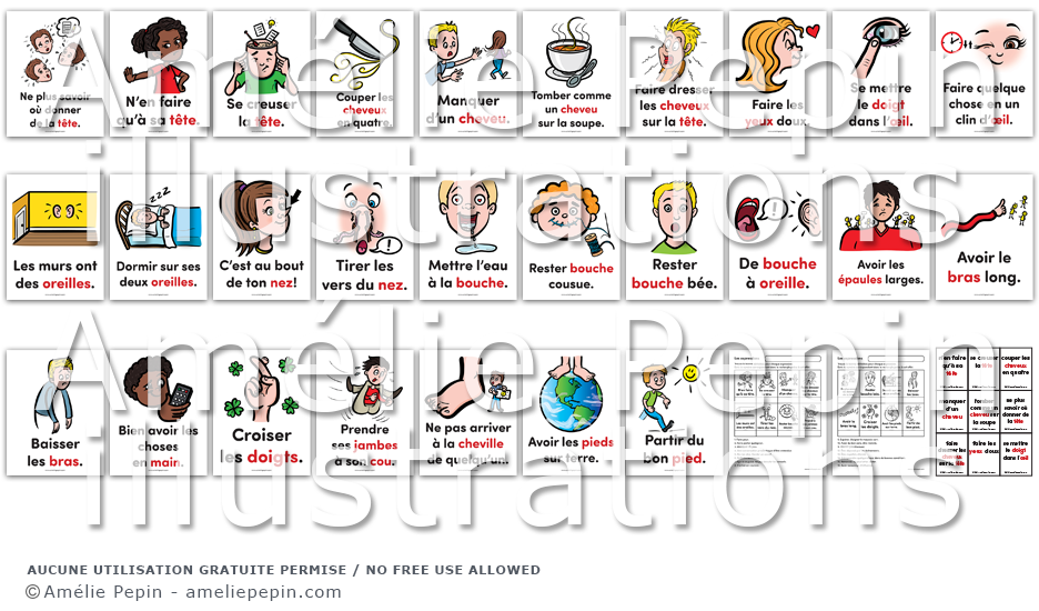 Voici 27 affiches illustrées pour travailler quelques expressions populaires en lien avec les parties du corps. Vous pouvez les regarder sur TNI ou les imprimer. Beau sujet de conversation pour le thème du corps humain! Parmi ces expressions, on retrouve: "n'en faire qu'à sa tête", "se creuser la tête", "couper les cheveux en quatre", "manquer d'un cheveu", "se mettre le doigt dans l'oeil", "les murs ont des oreilles", "tirer les vers du nez", "rester bouche cousue", "mettre l'eau à la bouche", "rester bouche bée", "avoir le bras long", "baisser les bras", "partir du bon pied" et bien d'autres.