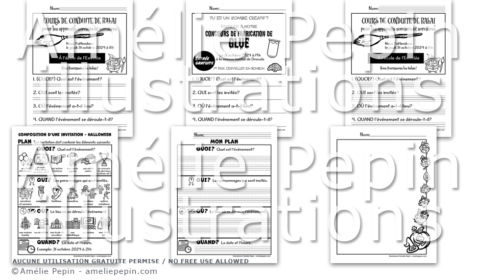 - Le plan illustré pour une composition d'invitations d'Halloween. Des suggestions sont données pour répondre aux questions "Quoi? Qui? Où? Quand?"