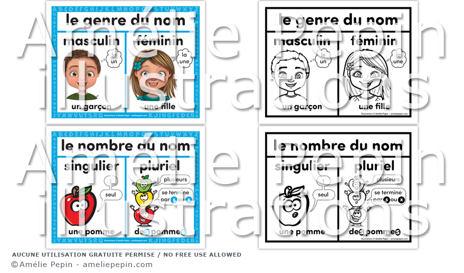 Le genre et le nombre du nom illustrés sur deux affiches.