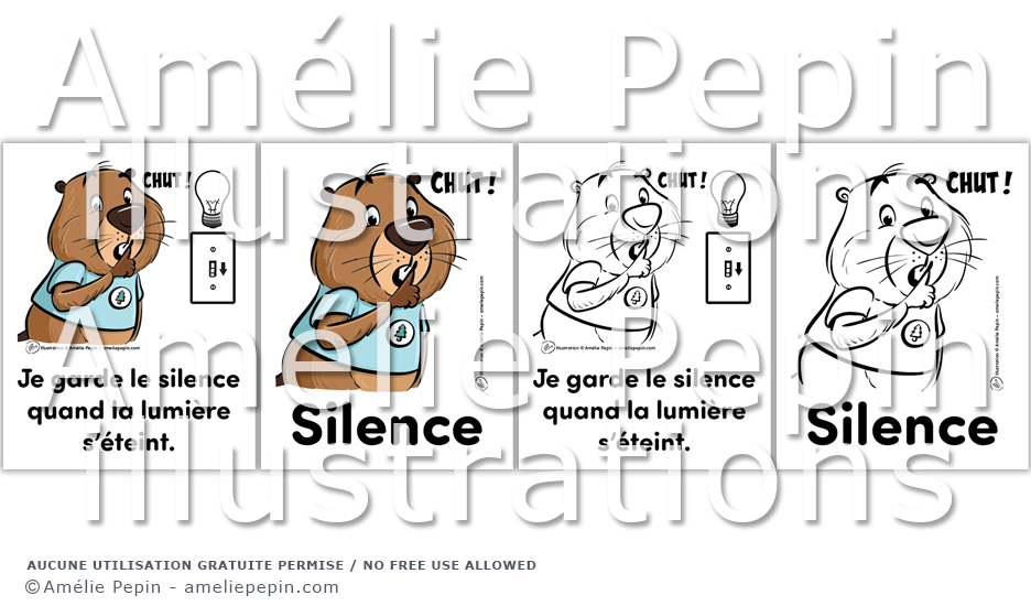 Règles de classe illustrées avec des castors: "Silence" et "Je garde le silence quand la lumière s'éteint."