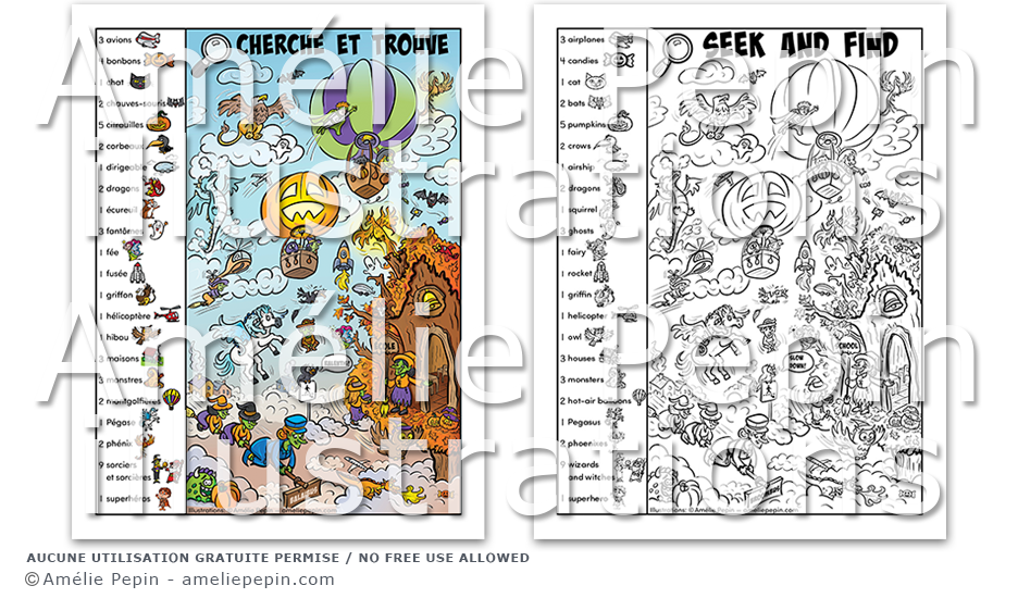 L'enfant cherche et trouve les éléments de la liste dans l'illustration. Les éléments à découvrir sont illustrés pour aider l'enfant à apprendre leur nom. C'est un jeu qui développe le sens de l'observation, la concentration et le vocabulaire. L'enfant compte également les éléments jusqu'à neuf. Une version en noir et blanc est incluse et n'attend plus qu'à être coloriée!