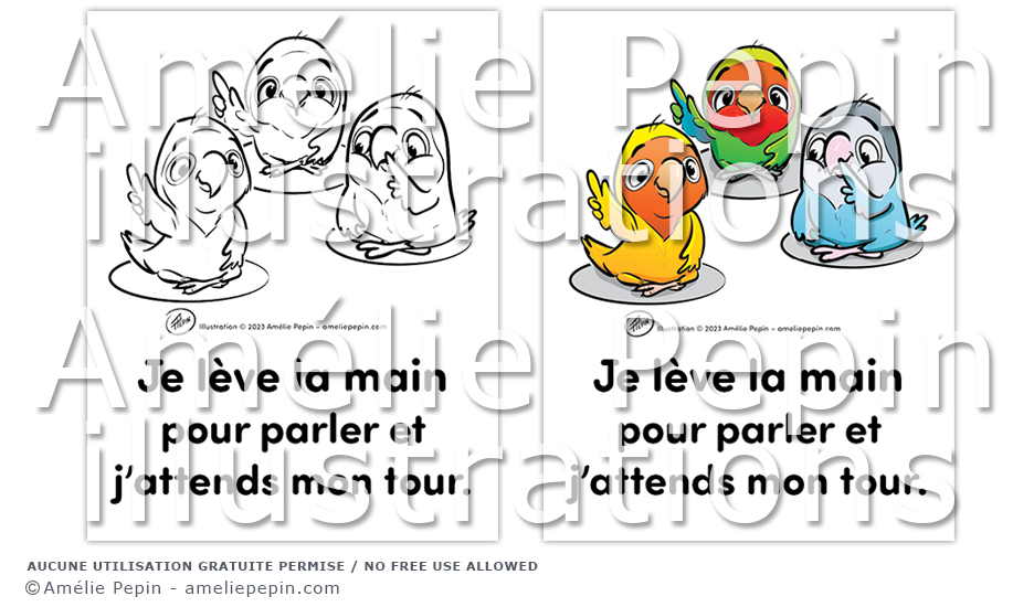 Règle de classe illustrée avec des inséparables: "Je lève la main pour parler et j'attends mon tour."