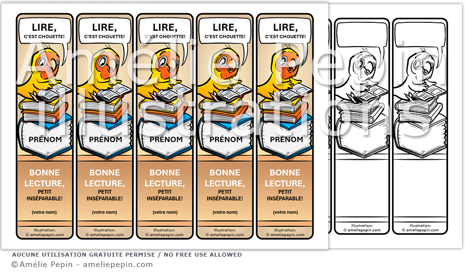 Signets aux coins arrondis illustrés avec un inséparable assis sur une pile de livres. Les textes suggérés que vous pouvez changer sur le signet sont: «Lire, c'est chouette!» et «Bonne lecture, petit inséparable!».