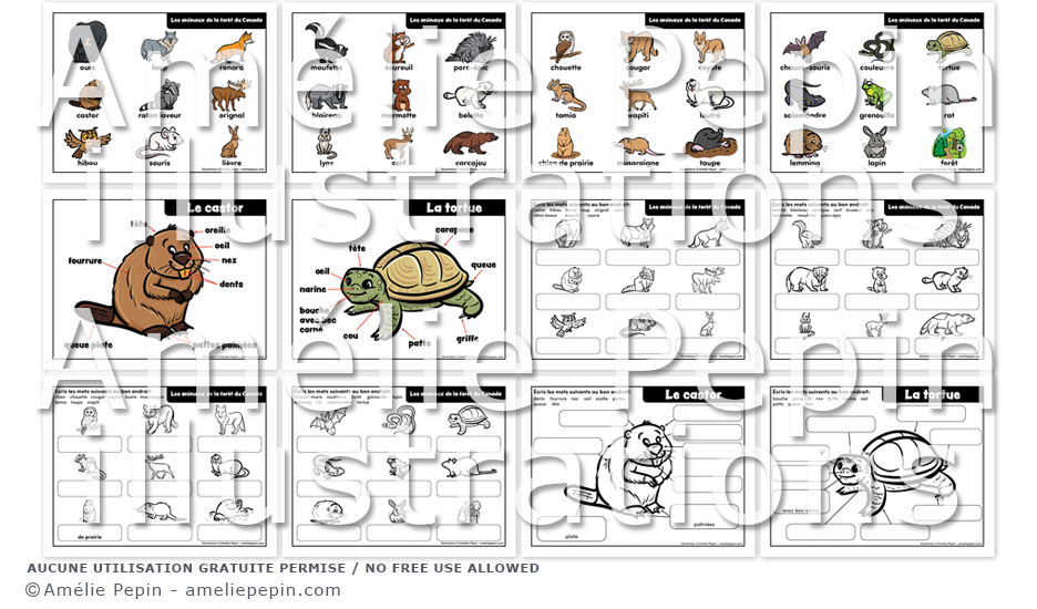Imagier sur le thème des animaux de la forêt boréale. Le dossier contient 6 affiches et 6 feuilles d'activités pour apprendre le vocabulaire en lien avec les animaux de la forêt du Canada. Dans les activités, l'enfant écrit les mots demandés au bon endroit.