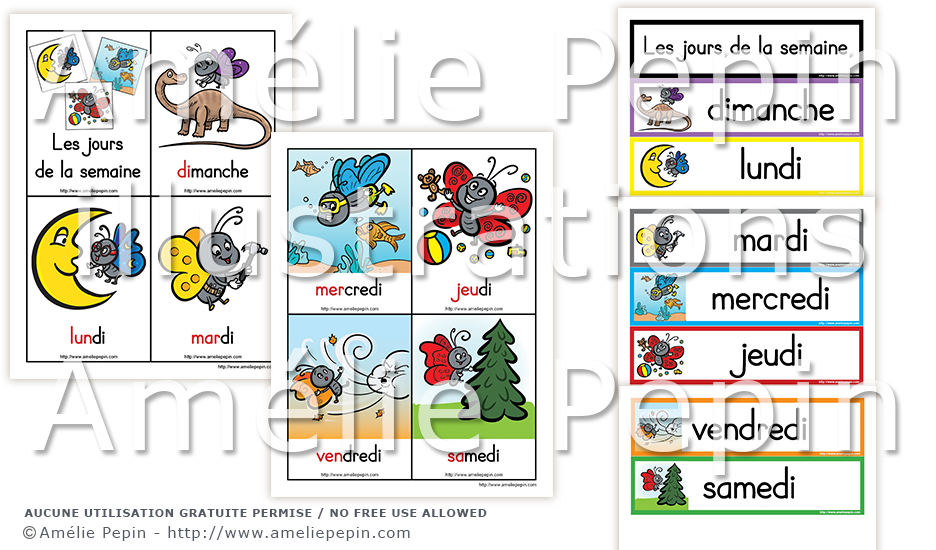 Chaque jour de la semaine est représenté par un papillon avec un élément dont le son débute par la première syllabe du jour (DImanche, DInosaure).