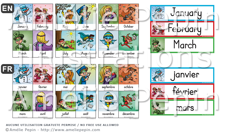 Mots-étiquettes des mois de l'année représentés par des superhéros.
