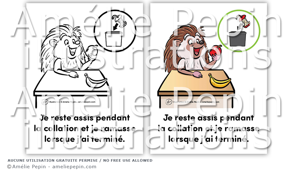 Règle de classe illustrée avec un hérisson: "Je reste assis pendant la collation et je ramasse lorsque j'ai terminé."