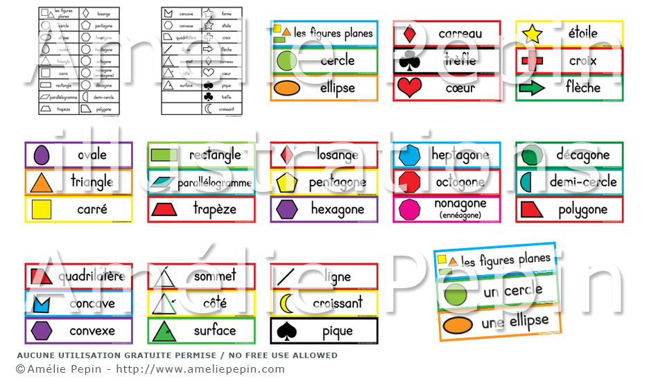 Les mots illustrés sont: les figures planes, cercle, ellipse, ovale, triangle, carré, rectangle, parallélogramme, trapèze, losange, pentagone, hexagone, heptagone, octogone, ennéagone (nonagone), décagone, demi-cercle, polygone, concave, convexe, quadrilatère, ligne, sommet, côté, surface, forme, étoile, croix, flèche, carreau, coeur, trèfle, pique, croissant.