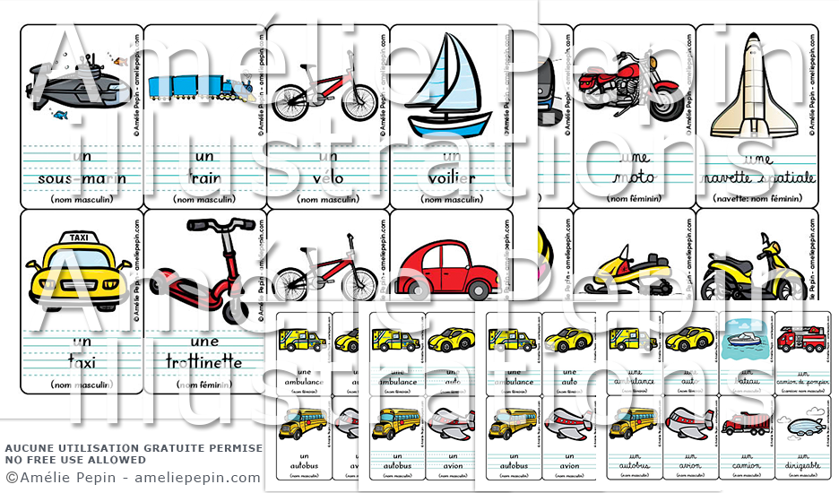 Les mots illustrés sont: ambulance, autobus, auto, avion, bateau, camion, camion de pompier, dirigeable, fusée, hélicoptère, métro, montgolfière, moto, motoneige, navette spatiale, scooter, sous-marin, taxi, train, trottinette, vélo, bicyclette, voilier, voiture, voiture de course, voiture de police.