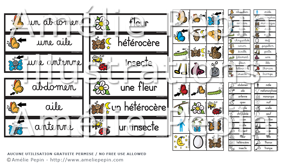 Les mots illustrés sont: abdomen, aile, antenne, apex, chenille, chrysalide, cocon, écaille, filament, fleur, hétérocère, insecte, mâle, métamorphose, monarque, nuit, ocelle, oeuf, papillon, patte, soie, tête, thorax, trompe.